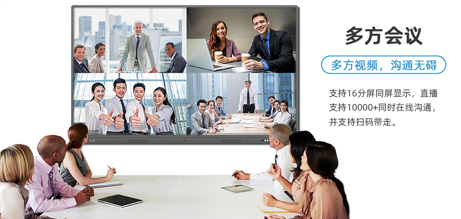 支持電腦、安卓手機(jī)、IOS、MAC OS等生態(tài)設(shè)備互聯(lián)互動(dòng)。最大支持16分屏同屏顯示,直播情況下可以支持10000+方同時(shí)在線溝通。并支持掃碼帶走。